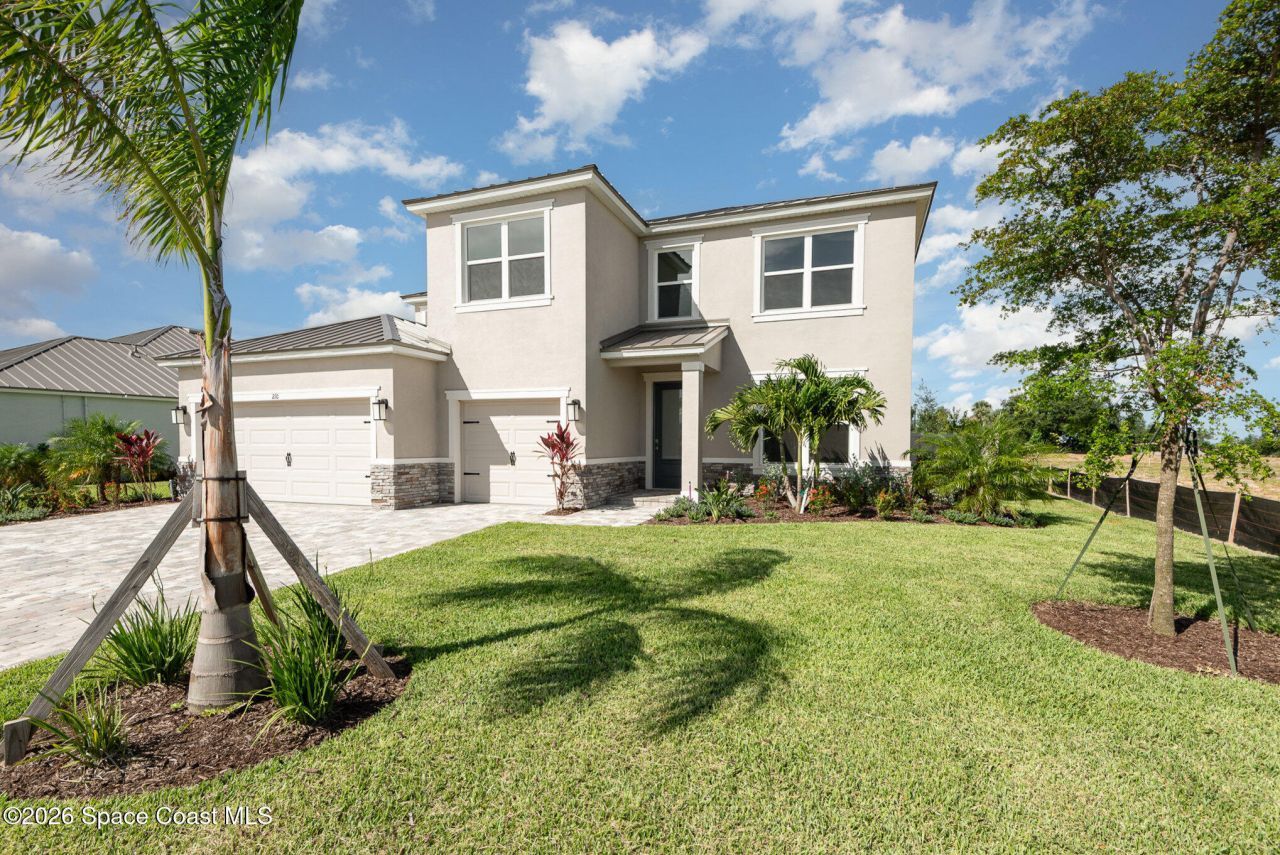 Introducing the jordyn II at Riverwalk of Cocoa - a beautifully designed 2 story home with 3,278 sq. ft. 4 bedroom, 3 bathrooms and a 3 car garage with an Epoxy Coating for an added level of elegance. Its stunning curb appeal includes a paver driveway, lush landscaping and an irrigated lawn with its own irrigation pump. Luxurious plank flooring in main living and wet areas and carpeting in the bedroom for a warmth feeling. The Chef-inspired kitchen features 42 cabinet with a set of glass door, quartz countertop and back-splash, appliances including the French door refrigerator and to top it off with a double island. The spacious primary suite offers dual sinks with the Bank of drawers and separate shower with a double walk in closet. Built with energy efficient features and smart home. For added safety, impact windows was installed in this home.