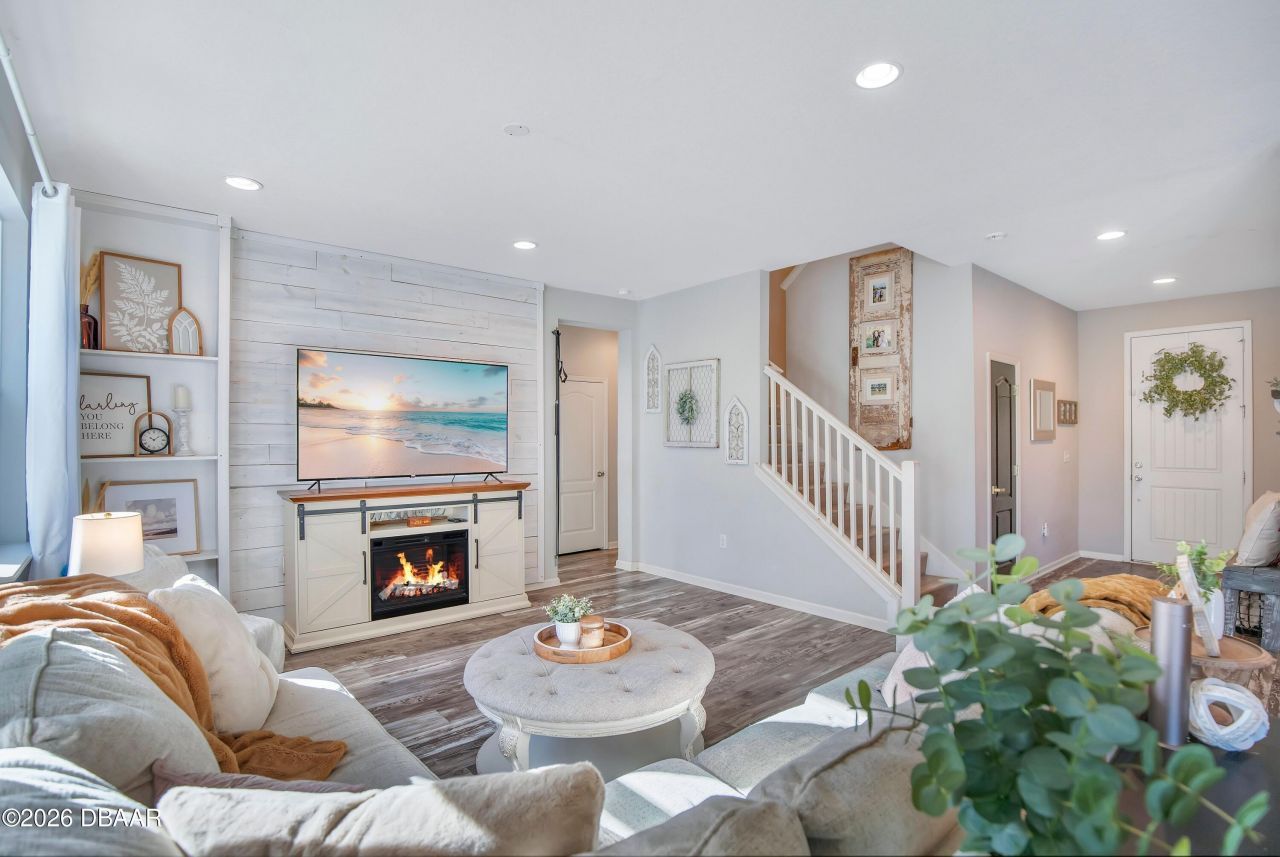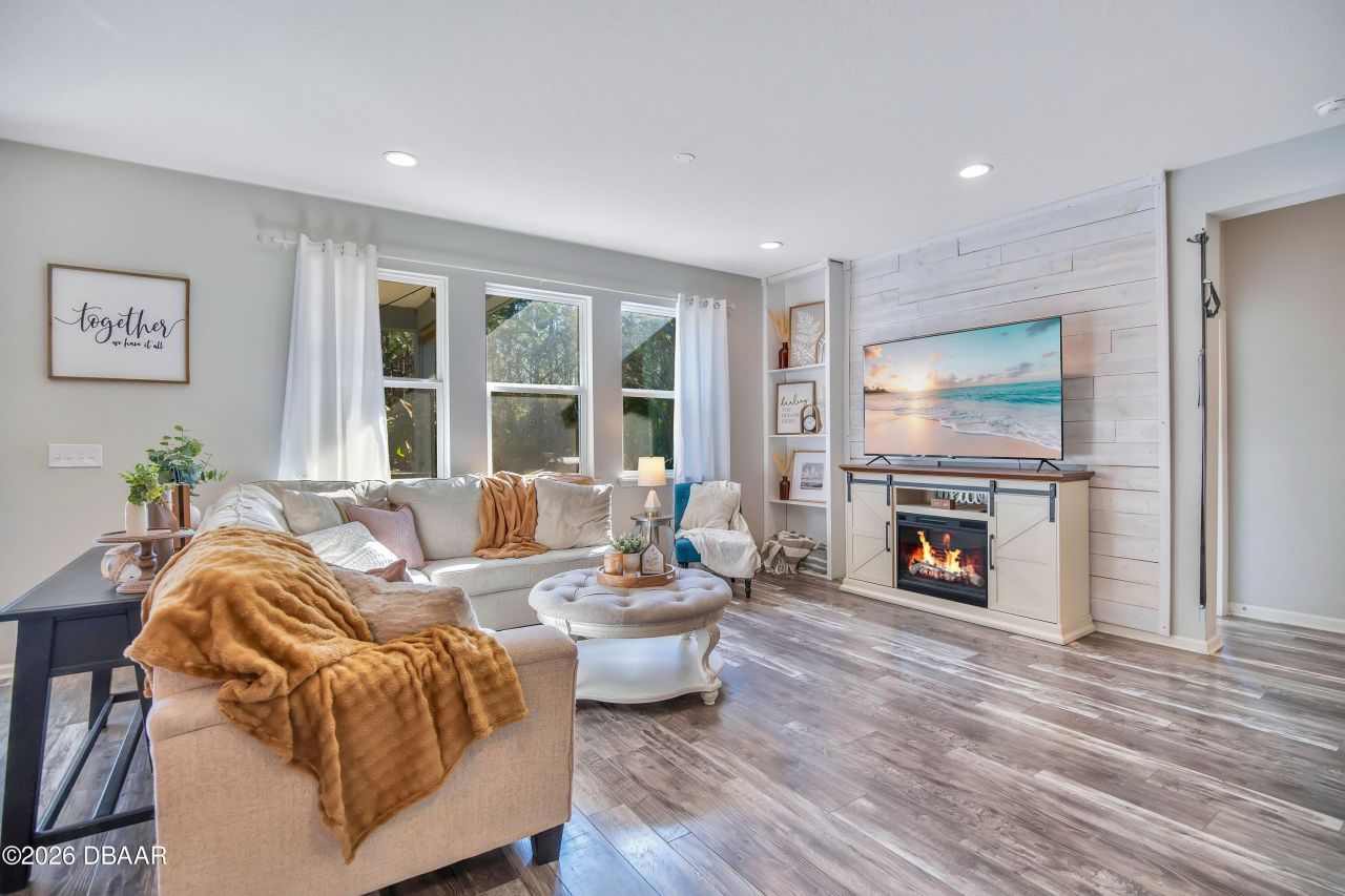 Welcome to 171 Pergola Place, a beautifully upgraded 4-bedroom, 3-bath, two-story home offering modern finishes, flexible living spaces, and a truly beautiful waterfront backyard setting in Ormond Beach.Inside, the main level features 9-foot ceilings and tongue-and-groove luxury vinyl plank flooring, creating a bright and welcoming atmosphere. The living room is filled with abundant natural light, enhanced by large windows and anchored by a whitewashed wood accent wall that adds warmth and character. A downstairs bedroom adjacent to a full bath, currently used as an office, provides ideal flexibility for guests or work-from-home needs.The kitchen is both stylish and functional, showcasing granite countertops, ample cabinetry, and an adjoining lounge/study area with custom built-ins, currently styled as a bar and book nook. Open living and dining spaces flow seamlessly, perfect for entertaining and everyday living. Moving upstairs, you'll find a spacious family loft with a built-in library nook, a large laundry room, two additional bedrooms, and a full bathroom. The generous primary suite features vaulted tray ceilings, a spa-like ensuite with dual sinks, a soaking tub, a separate shower, and an impressive walk-in closet with built-in shelving and storage. The primary suite, loft, and one additional bedroom all enjoy pond and preserve views.Step outside to a backyard designed for year-round enjoyment. The covered patio features a perfect entertaining area, opening to a paver and pebble grilling space and a turfed fire-pit area ideal for relaxing evenings. The yard is framed with white PVC privacy fencing on both sides and black wrought iron fencing along the rear, preserving unobstructed views of the pond and wooded preserve beyond.The pond is stocked with large bass, offering a rare and peaceful waterfront experience right in your own backyard.This home combines modern upgrades, thoughtful design, and a one-of-a-kind outdoor setting, an exceptional opportunity in Ormond Beach.Square footage received from tax rolls. All information recorded in the MLS intended to be accurate but cannot be guaranteed.